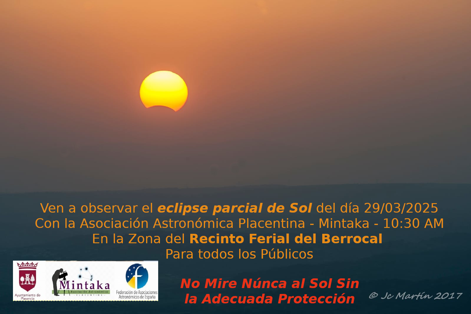 El próximo día 29 de marzo, sábado entre las 10:30 am y las 13:00 pm horas aproximadamente, tendrá lugar un eclipse parcial de sol, cuyo máximo se estima sobre las 11:47 am. Y que podremos observar, si el tiempo lo permite desde el recinto ferial del Berrocal en Plasencia. Cáceres. A los efectos llevaremos unas gafas especiales para la observación solar, a la venta al público por el módico precio de 6,50€ además de contar con los equipos astronómicos adecuados, dotados de filtros especiales para la observación del Sol y de éste fenómeno. La asistencia al evento es gratuita y para todos los públicos. SE RECOMIENDA ENCARECIDAMENTE, NO MIRAR DIRECTAMENTE AL SOL NÚNCA. BAJO NINGUNA CIRCUNSTANCIA. DURANTE ESTA JORNADA DE OBSERVACIÓN. En todo caso seguir las indicaciones de los monitores y no usar cristales de soldadura o peor aún ahumados. Que no garantizan su salud ni bienestar ocular.